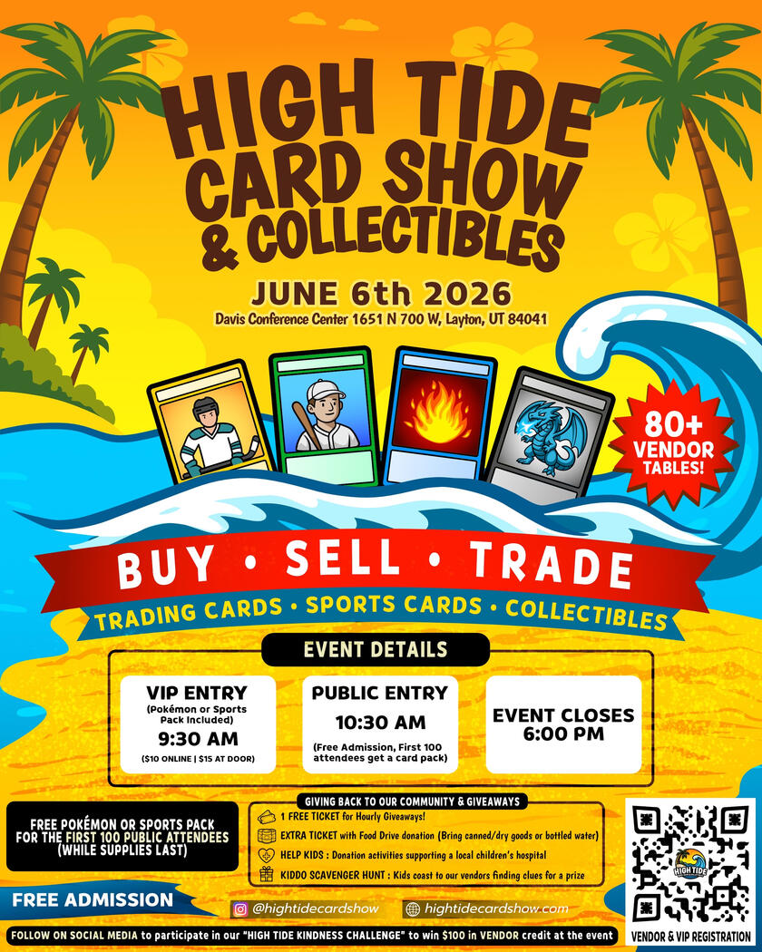 High Tide Card Show & Collectibles is a community focused event featuring TCG, sports cards, collectibles, and more! Enjoy giveaways, family fun, and the first 100 attendees get a free Pokémon or sports pack (while supplies last)Next Event is June 6th at the Davis Conference Center