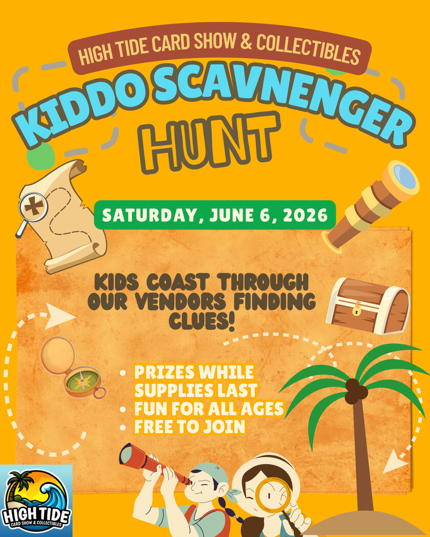 High Tide Card Show & Collectibles is committed to making a positive impact in our community while creating a fun experience for attendees of all ages.During the event, we will host activities where attendees can donate to support a local children’s hospital. Anyone who participates will be entered into a drawing for a chance to win a special prize.We will also be holding a food drive to support those in need. Guests who bring canned food, dry goods, or bottled water will receive an additional entry into the prize drawing.For younger collectors, we will have a Kiddo Scavenger Hunt, along with free Pokémon or sports card packs for the first 100 attendees (while supplies last).Leading up to the event, we will also be hosting the High Tide Kindness Challenge on social media. Participants who perform acts of kindness and tag High Tide can be entered to win $100 in vendor credit redeemable at the event.At High Tide, collecting cards and collectibles is just part of the experience, we’re also building community and giving back.